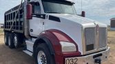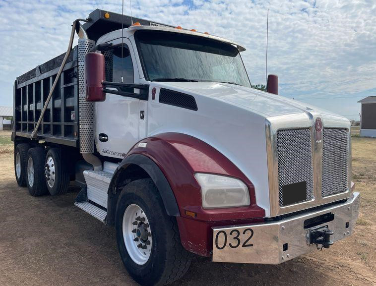 The 2016 Kenworth T880 dump truck has 243,620 miles on the odometer and 11,231 hours on the meter. It is powered by a Paccar MX-13 engine with a 12.9L displacement and 6 cylinders, running on diesel fuel. The engine is equipped with an engine brake.